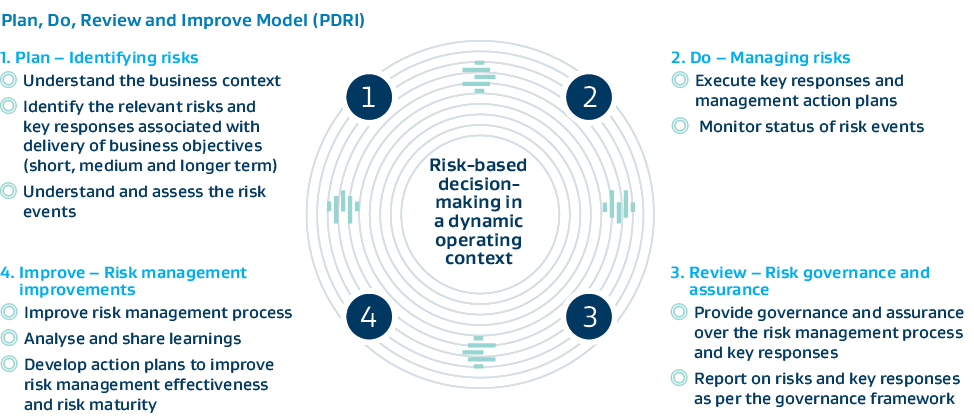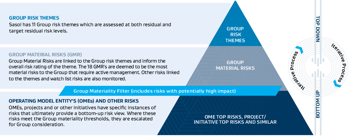 Managing risks is an essential part of good corporate governance and effective leadership. It is fundamental to how the company is managed at all levels and is embedded into our key decision-making processes and day-to-day activities. Risk management comprises the principles and practices to deal with uncertainty in the business environment by minimising on the downside and capitalising on the upside potential as related to our business objectives. This is a dynamic process considering the ever-changing context within which Sasol operates, our business of today and business of tomorrow. Our approach is to identify, understand and respond to the material risks associated with our business, to manage these risks effectively to deliver on our business performance targets and strategic ambitions, and within our Group risk appetite and tolerance levels. Sasol continues to focus its risk management process on ensuring the adequacy, appropriateness and effectiveness of key responses to prevent or mitigate potential material risks through the application of combined assurance principles and practices.