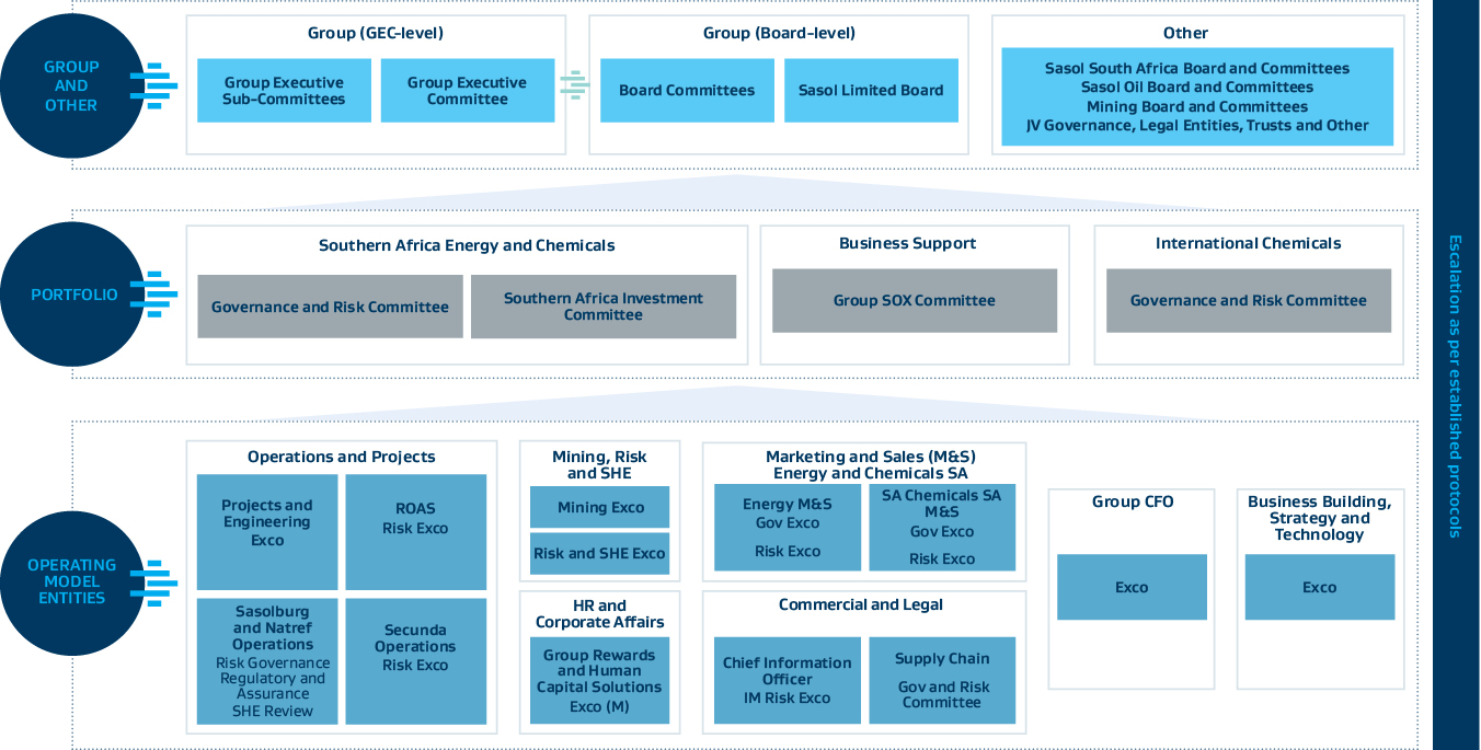 At Sasol, we apply an integrated risk governance model that embeds risk management into our strategic intent and execution. Oversight is driven by the Board of Directors, supported by Board Committees and the Group Executive Committee.